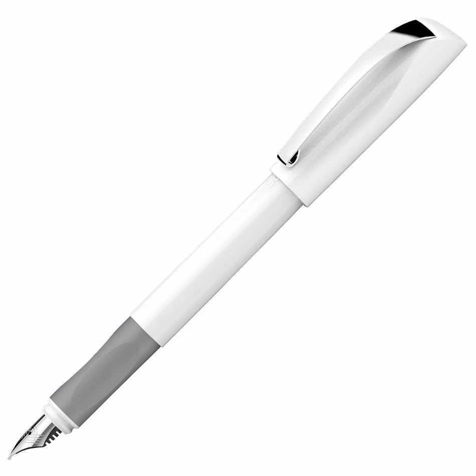 A Fountain pen with ergonomically rubberized grip profile and high-quality stainless steel nib with iridium tip. Modern design with elegant metallic look and striking curves. Equipped with a sturdy metal clip and royal blue, erasable standard ink cartridges. Equally suitable for right and left-handers.