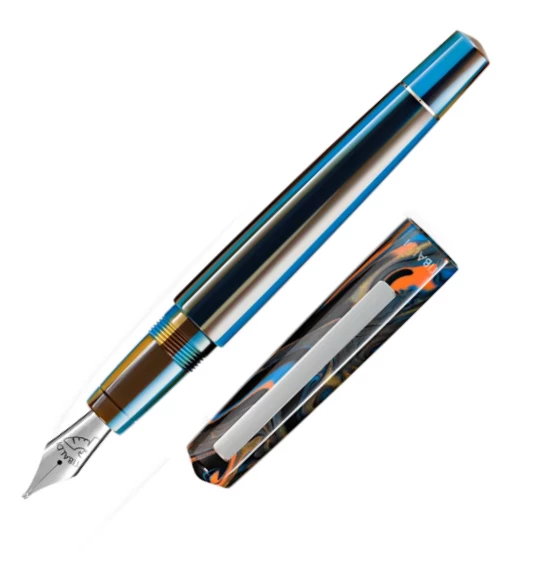 The Pen is handcrafted from blue, orange and black swirled resin. The Fountain pen features an ebonite feed and a stainless steel nib.